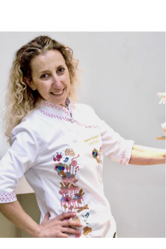 Chaqueta 65% polyester y 35% algodón con motivo de drip cake bordada a máquina. Las terminaciones en frente, cuello y puños están realizadas a mano